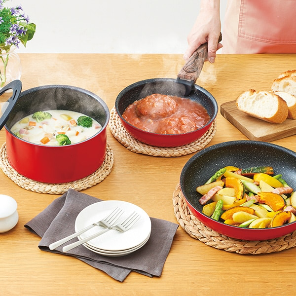 はぴねすくらぶさんお馴染みの「いろいろセット」として、用途に合わせて使い分けられる複数のサイズがセットになっています。これ一つで、焼く・炒める・煮る・揚げるなど、あらゆる調理をカバーできる充実の内容です。